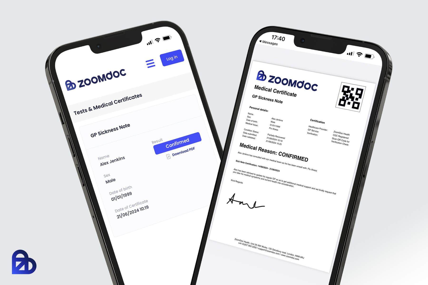 - Contact details of ZoomDoc Health with a QR code enabling a verification check.