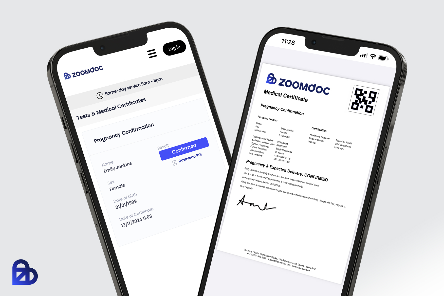 - Contact details of ZoomDoc Health with a QR code enabling a verification check.